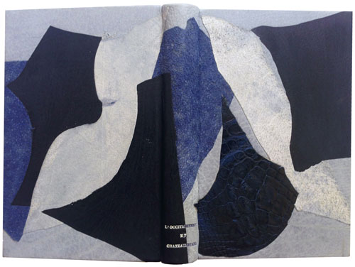 La reliure de l’ouvrage “De la musique, encore et toujours“ en buffle, lézard et se refermant avec une branche de corail,