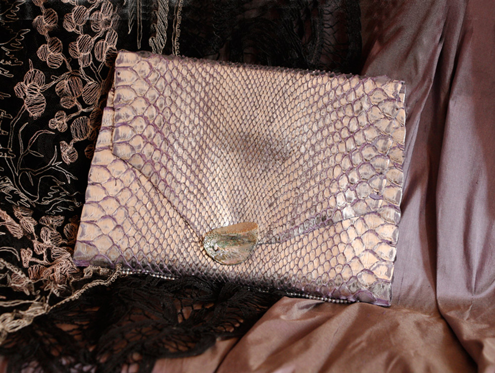 Python, agneau nacré gris, perles baroques et améthyste (15 x 20 cm)